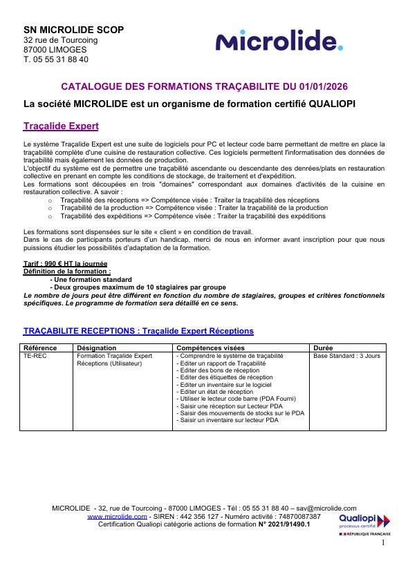 SN MICROLIDE est certifiée Qualiopi, catégorie actions de formation, depuis mai 2021. De ce fait, nous pouvons vous assurer une formation complète à la centralisation des données qui est un atout majeur dans la digitalisation des cuisines « connectées ».Optimisez votre traçabilité dans le respect de la réglementation et des démarches HACCP. Nous formons vos opérateurs à l’application de ces réglementations et à la maîtrise de nos solutions de traçabilité, en complète autonomie.