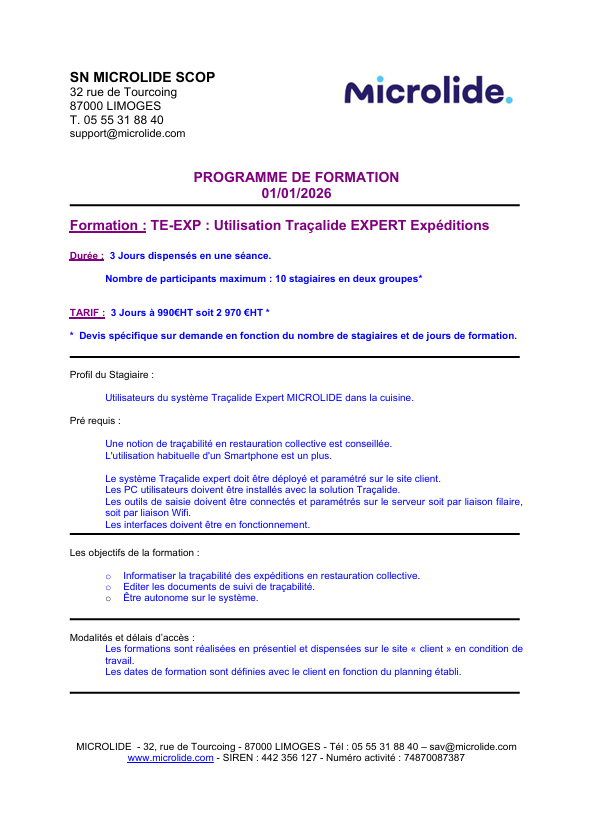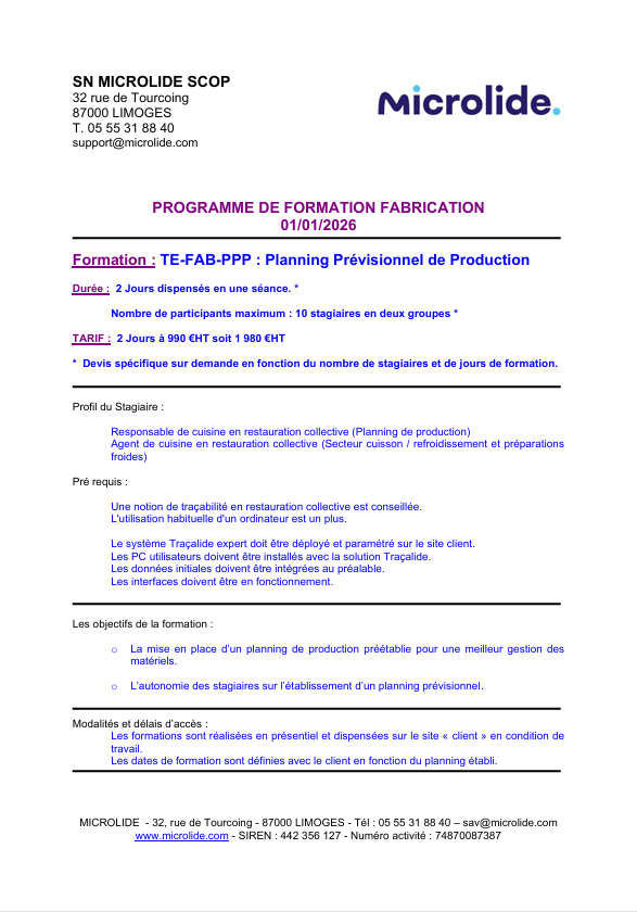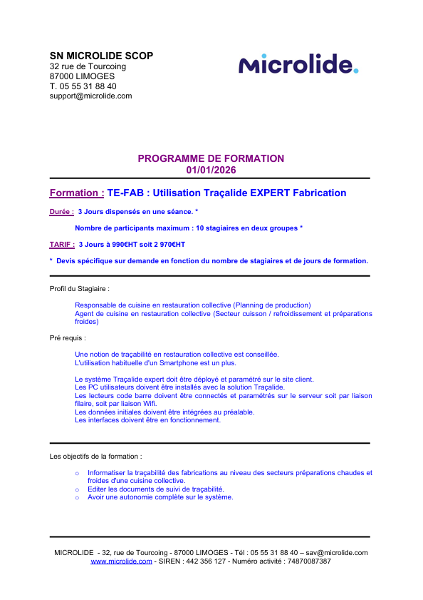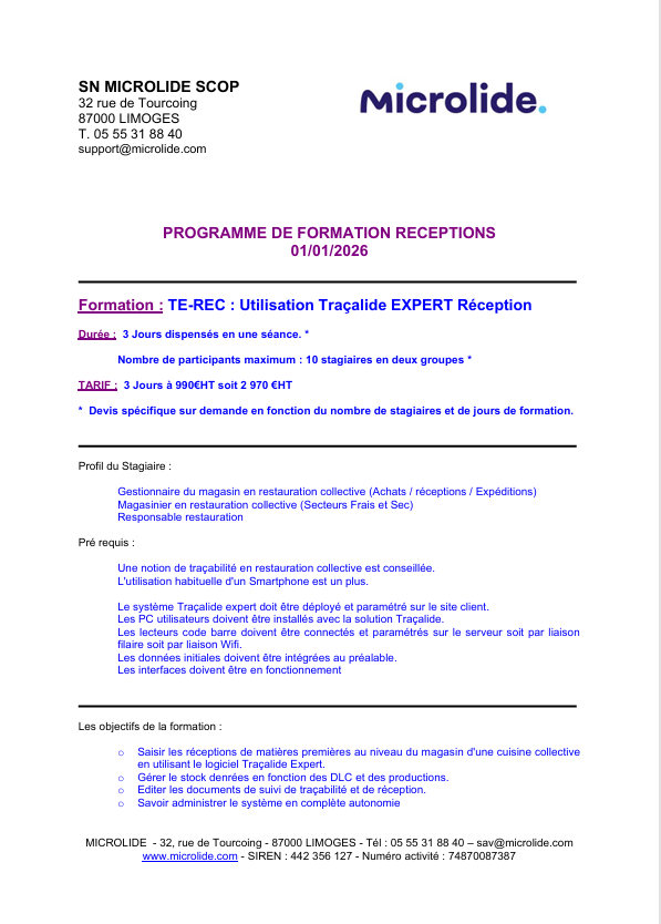 Nos formations peuvent être prises en charge par votre OPCO (OPérateur de COmpétence), non éligibles au CPF. Si vous êtes porteur d’un handicap, merci de nous le préciser avant l’inscription, pour que nous étudions les possibilités d’adaptation de la formation. Nos intervenants formateurs sont des experts dans le domaine de la traçabilité alimentaire, l’enregistrement de mesures, l’assistance technique, et sont qualifiés et formés en continu aux méthodes pédagogiques. Nos formations sont réalisées sur votre site, dans les conditions de travail.